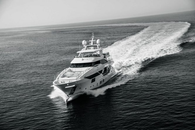 On the lower deck, the stern is left clear for a beach club and the swim platform has its own bar. The tender garage is moved forward and tenders and jet skis are launched through a side platform.
