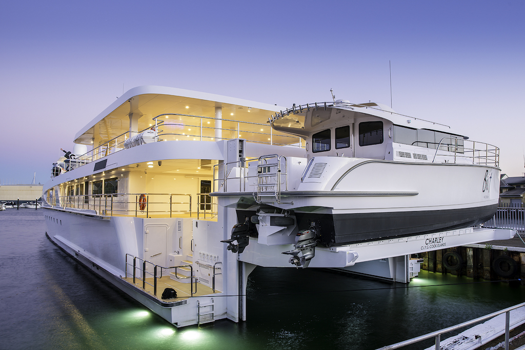 Naval architecture, exterior and interior styling are a work of the New Zealand company LOMOcean. Charley is believed to have excellent sea-keeping and fuel capacity, along with providing a significant amount of space for transporting and storing tenders and water toys. The 12-metre custom built catamaran tender Vicky with its specially engineered launch and retrieval platform positioned at the stern of the vessel.