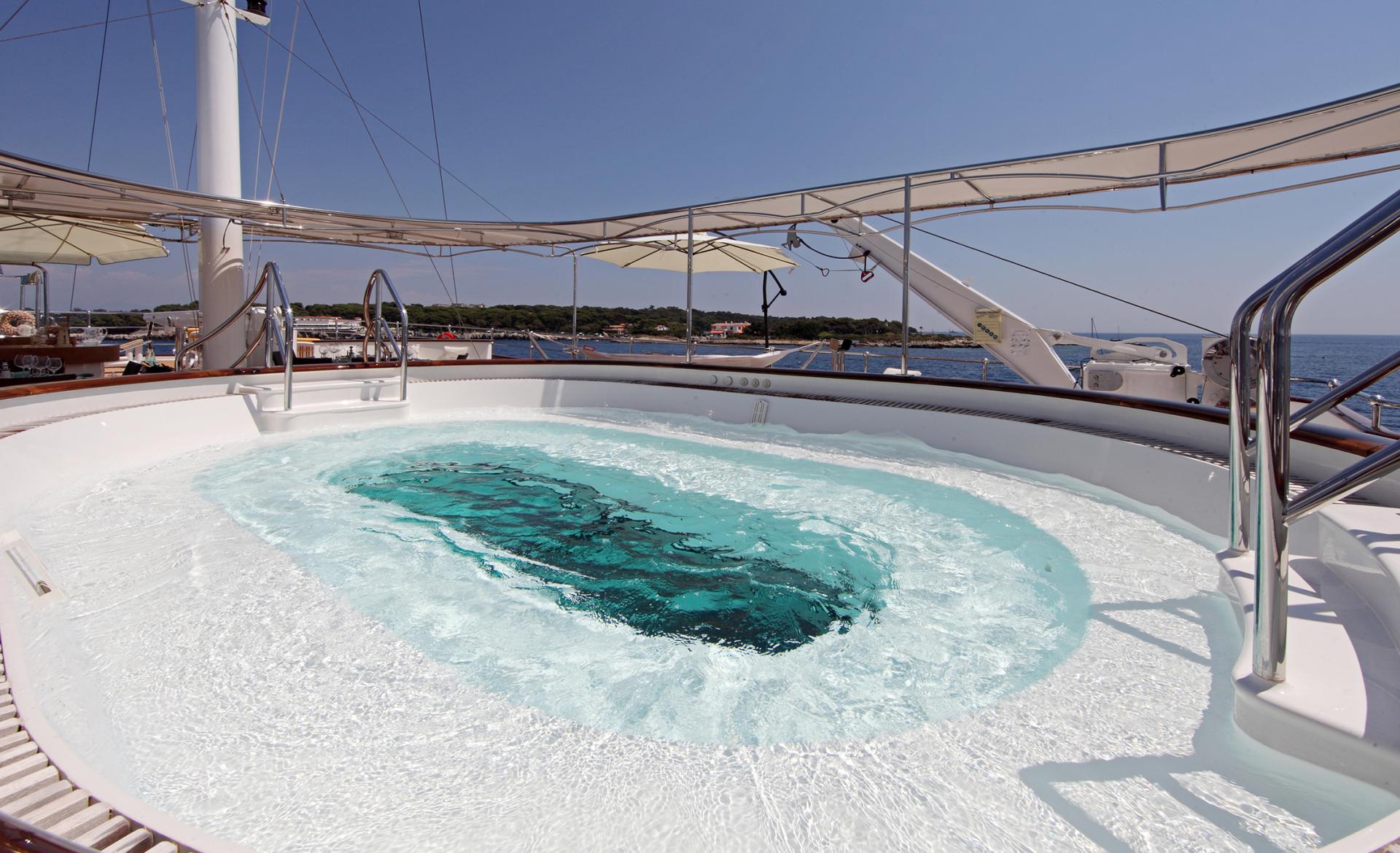 On deck, SHERAKAN is ideally suited for Tropical yachting vacations, with vast teak decks and great entertaining spaces. The main deck aft is shaded with alfresco dining and sitting areas. On the upper level, there are oversized plush seats and partial shade. This deck also offers a forward sunning area. On the sundeck, charter guests are spoilt for choice, from the sunbeds to her deluxe pool/jacuzzi, bar area and exterior dining. CAT engines achieve speeds of 11 – 13 knots, while zero speed stabilizers ensure a comfortable voyage.