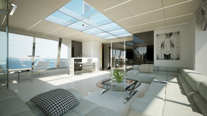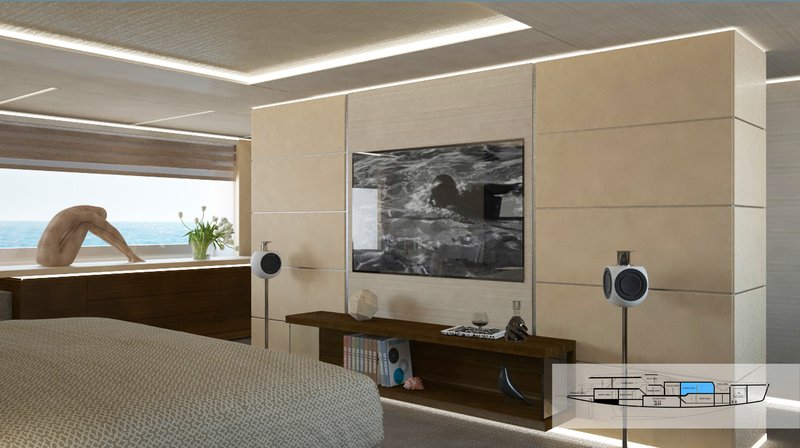 The owner’s private apartment can be found on the fore part of the main deck, whilst the lower deck hosts four en-suite cabins with queen size berths convertible to twins. There is also a wide stern saloon with bar, as well as separate and elevated pilot lounge overcoming the cinema/entertainment lounge and the dining room.