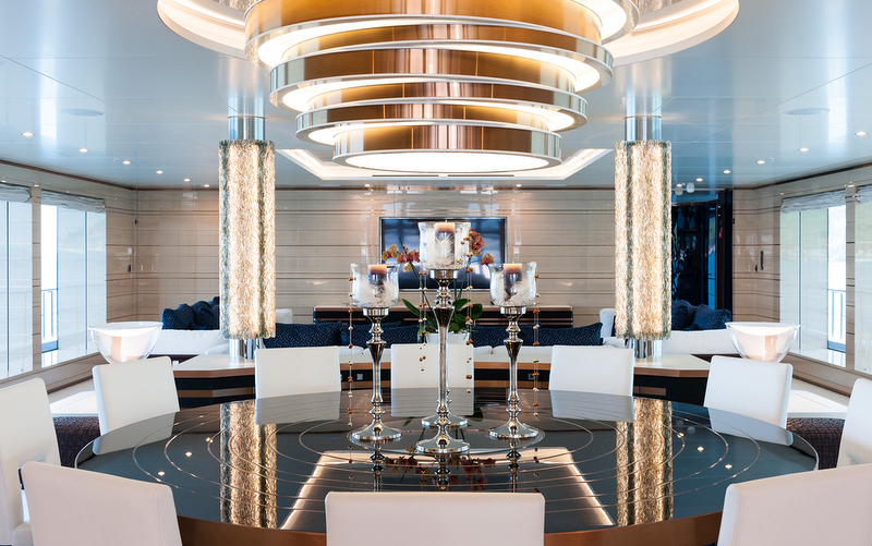 The favourite aspect of superyacht IRIMARI (hul 632) is the variation of a common design vocabulary in order to achieve spaces which flow into each other and form a sequence with well-matched surfaces. Therefore the different rooms create a calm and inviting environment without ever being boring. The design works so well due to the attention that is purposefully grabbed by highlights, which ensure the individuality and purpose of each room. These highlights never compete with each other, but appeal with the overall ambiance on board. They are designed to complement and enhance each other.