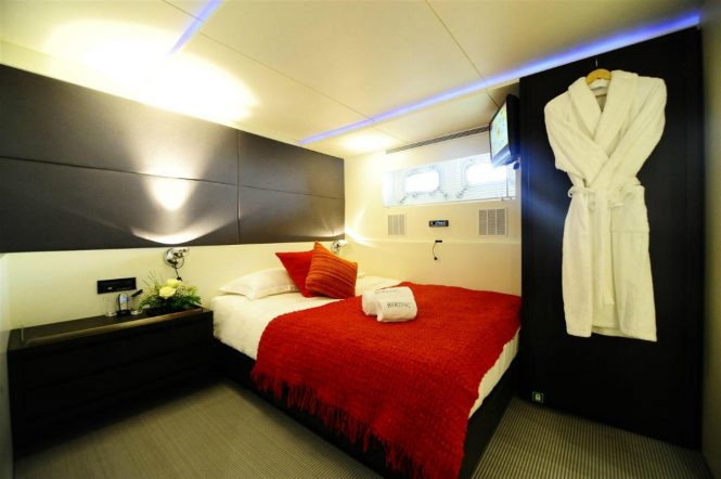 On the main level forward and full beam of the yacht, is her master stateroom. An upper sky lounge continues the motif and has a seating area and wine bar. Additional accommodation is on the lower deck, offering 2 double and 2 twin suites.