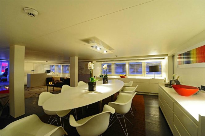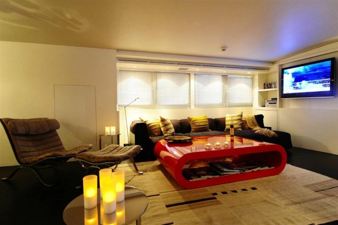 Her interior styling is contemporary using a blend of muted neutral tones and accents of carefully chosen art deco colours. The salon is laid to an open plan with the lounge aft and dining forward with beautiful wooden floors and plenty of natural light.