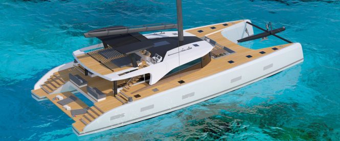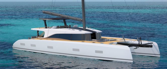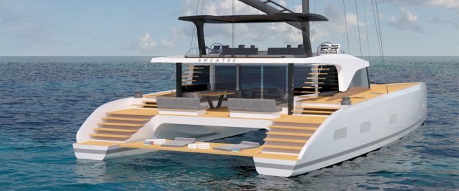 The 27m/88.6ft luxury catamaran was developed with long-term partner Nauta Design who created the interior and exterior styling. Naval architecture came from catamaran specialist design firm Berret-Racoupeau, based in La Rochelle, France. The SWCAT90 will be constructed in carbon composite for a lightweight draft and combines the best elements of a monohull with the advantages of a broader beam for more space onboard (comparable to a 39m/128ft monohull), a reduced draft to navigate shallow waterways and the greater stability that two hulls provide.