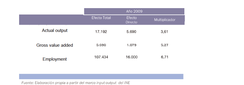 The economic multipliers for these figures show that that a multiplier of 6 greatly increases the employment figures (direct + indirect employment); the GVA has a multiplier of 5; and actual productive output has a multiplier of 3.61. The recreational boat sector is a sector with a high multiple effect due to the number and range of ancillary services and products supplied. See the graphs below for the multiplier effect and the overall impact on the Spanish economy.