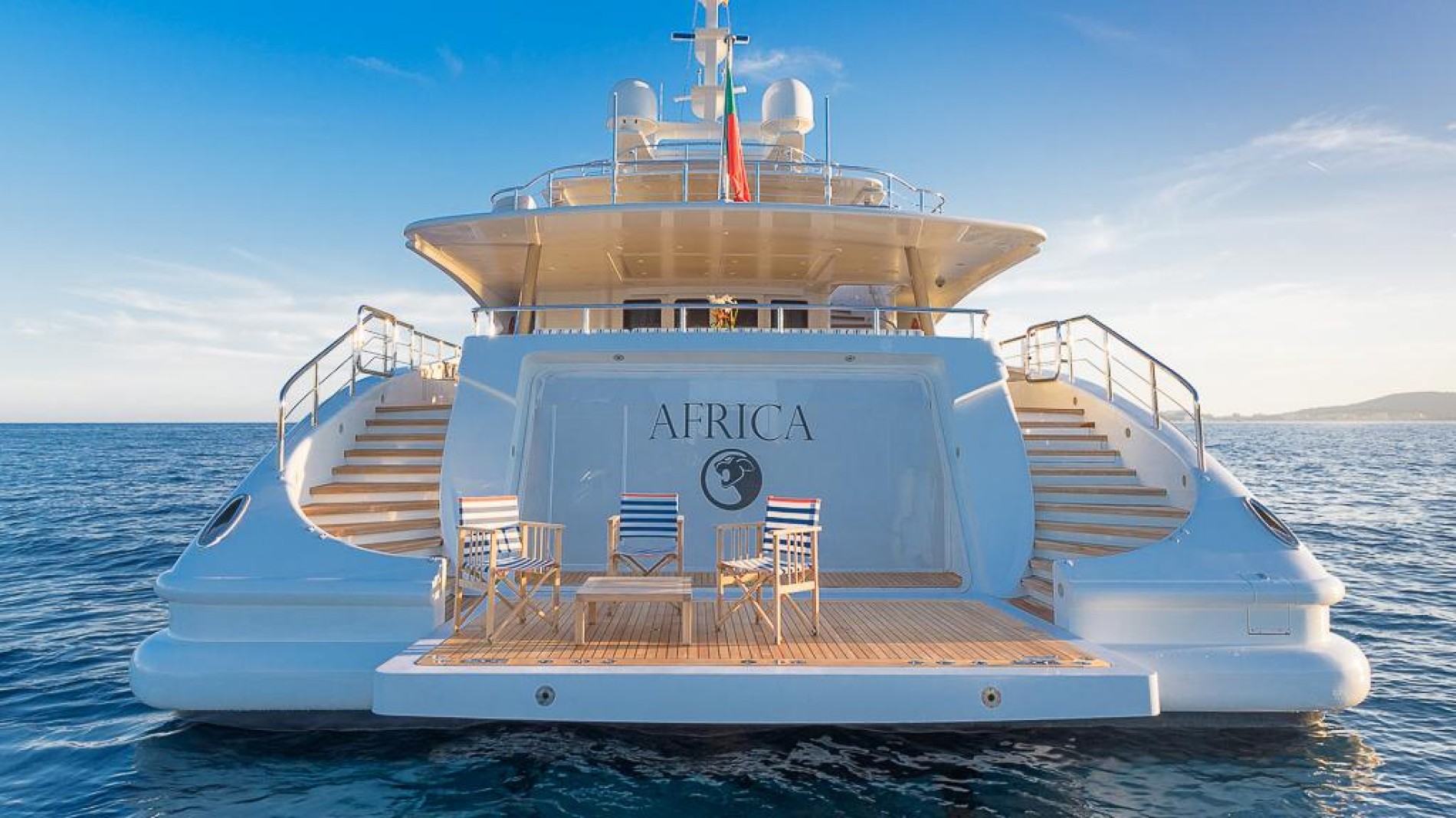M/Y AFRICA’S sundeck is ideal for sunny luxury Mediterranean yachting vacations, here charter guests can dine alfresco, sunbathe, soak in the jacuzzi, or make the most of the huge inflatable slide! Further accommodation is on the lower deck, comprising 2 double and 2 twin suites.