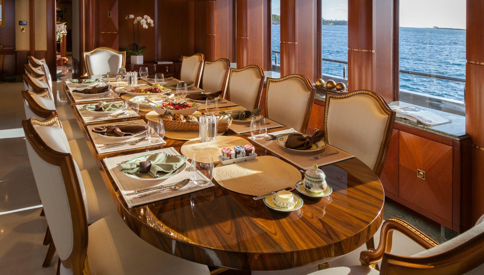 Indoors, the port side has a large lounge with plush furnishings in a vibrant blue to complement the dark wooden panelling, while the formal dining area is situated on the starboard side and benefits from the many windows for spectacular views and plenty of natural light.