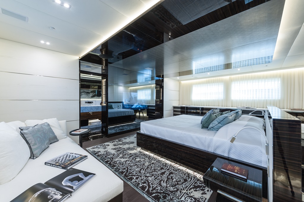 Built by Admiral Yachts in 2014, her exterior styling comes from Luca Dini Design, while Versus Design completed the interiors in conjunction with Admiral Centro Stile. Her monochrome interiors manipulate light through texture to create a sophisticated modern environment.