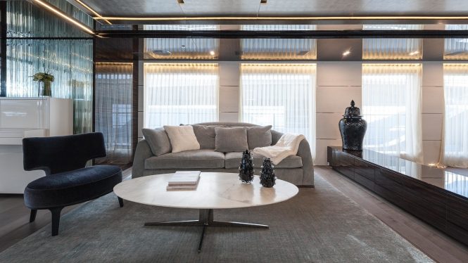 The main salon uses full-height windows to fill the interior with natural light and to ensure that diners at the lavish formal table never miss a moment of the beautiful scenery. To the aft, there is a sofa placed beside each window for best use of the light duringthe day, and in the evening guests can sit and watch a film on the drop-down widescreen TV.