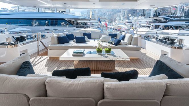 The main deck aft is a spacious outdoor relaxation are that places half the lounge in the sunshine and half in the shade. Two staircases lead down to the swim platform and the beach club, where guests can sunbathe or go for a swim before an alfresco meal at the dining table on the upper deck aft.