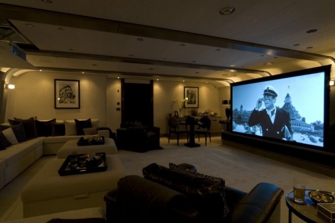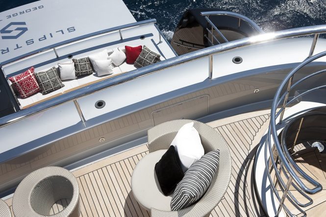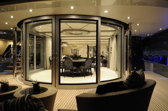 The sky lounge is set up for a night of entertainment: Black-out blinds drop down over the windows at the touch of a button while guests lie back on the broad sofa and chaise loungers. The alfresco dining table can be shielded by sliding glass doors to protect diners from sudden gusts. After a meal, guests can gather on the sofa and spend a romantic evening watching the sunset. For greater privacy, there is a single sofa on the Portuguese bow for sweeping forward views.