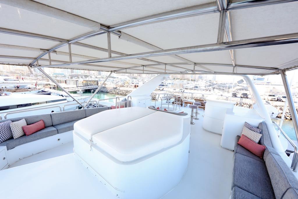 Start your day together in the timeless interior and plan your activities from the comfortable lounging area. Dine alfresco on the main deck aft for breakfast in the fresh air, then get ready for to spend time on the water toys from the swim platform.