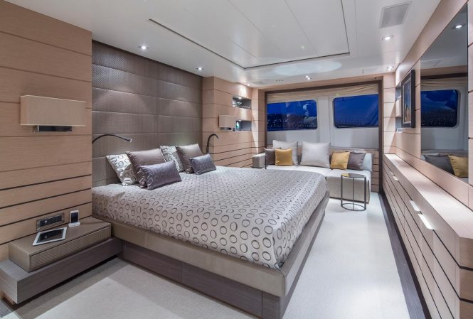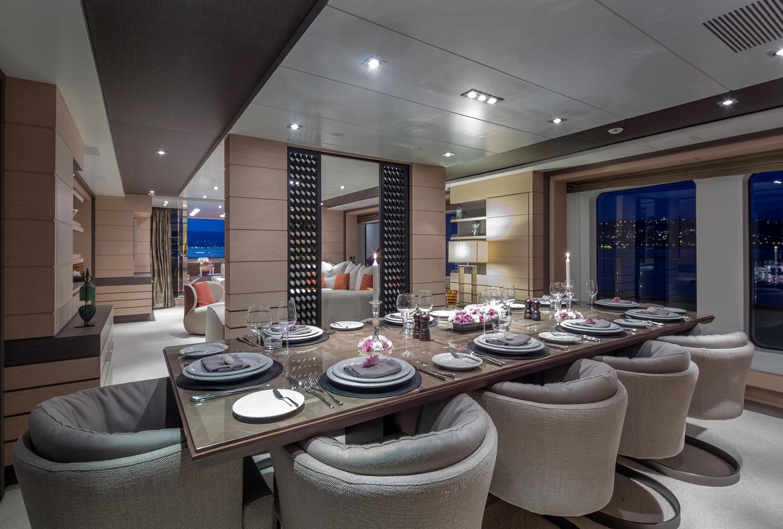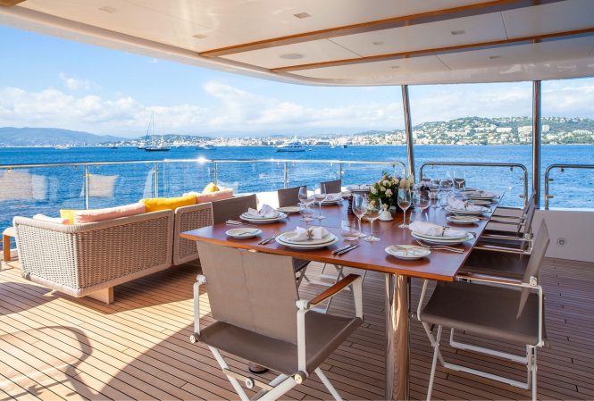 Guests have an excellent choice of alfresco dining and recreational areas: The main deck aft has a comfortable sofa placed near the stern ideal for casual alfresco dining after hours on the beaches of St Tropez and swimming in the Cote d’Azur Sea.