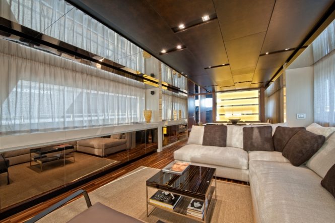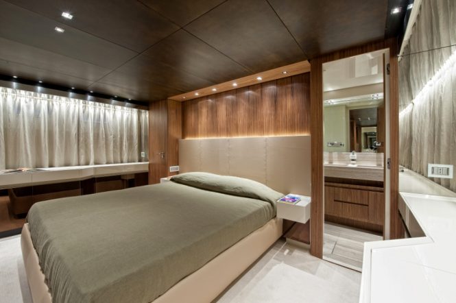 The main salon uses neutral tones and matt and gloss textures to amplify the light pouring in from the large windows along the port and starboard sides. The salon aft has an L-shaped sofa while the forward section has a glamorous formal dining table to serve up to eight guests. Alternatively, the main deck aft has a sturdy table for alfresco dining between six. Stairs connect down to the swim platform for ease of access to the tender for shore excursions, and the group can catch the sun on the bow on the large sunpad and enjoy uninterrupted views of your surroundings.