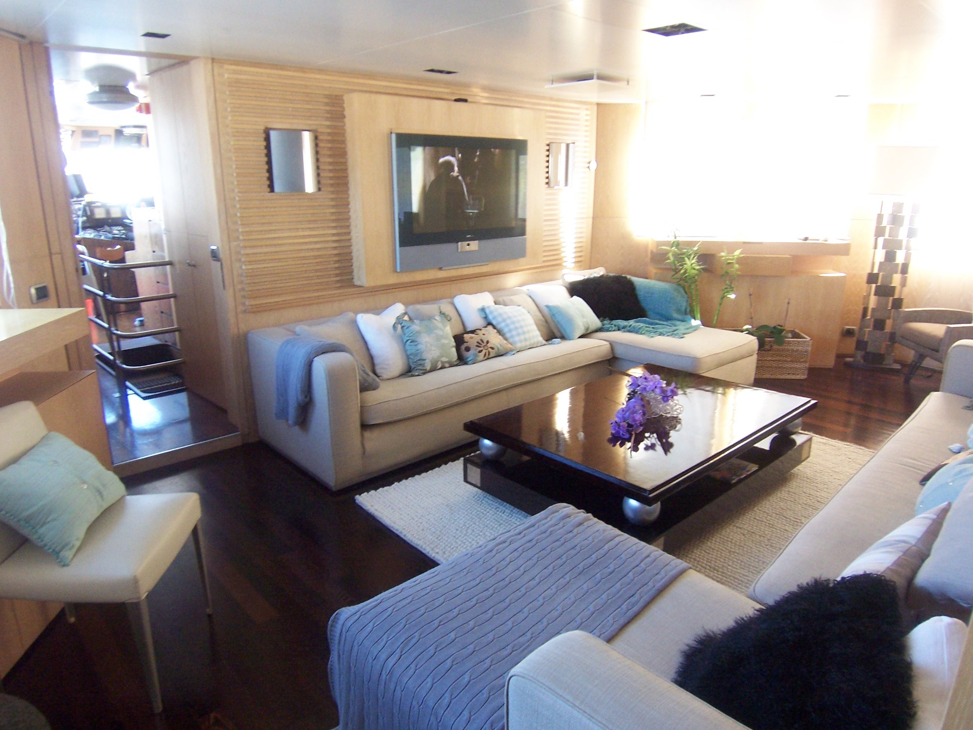 The interior of the main deck is divided into two spaces, the forward room using light wooden panelling and pale furnishings, providing a cosy living space for socialising and watching films in the evening.