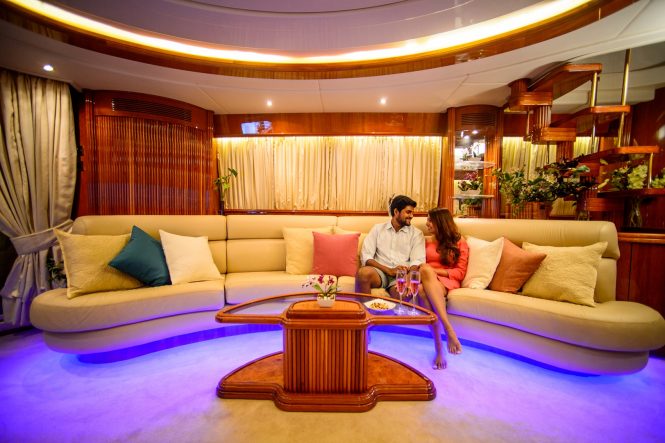 Built in 2008 and refitted in 2016, her interiors update the classic styling for a welcoming and functional interior: Two large crescent sofas receive plenty of natural light from the port and starboard windows, while the centre is left clear for moving between the alfresco seating on the main deck aft and the formal dining area. In the evening, floor lighting adds to the ambiance for a successful social gathering.
