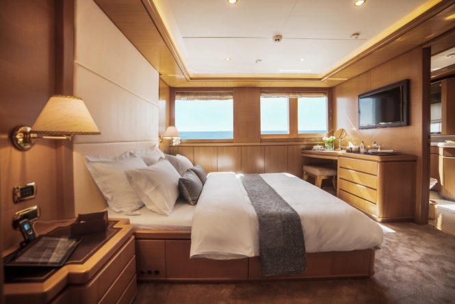 She boasts a lovely light interior décor of neutral fabrics, honey toned wood panels and bespoke timeless fixtures and fittings. There is an open plan main salon, offering a generous lounge aft with plush sofas, arm chairs and 2 coffee tables, forward the formal dining seats guests stylishly. An upper salon has additional comfortable sofas, coffee table and entertainment facilities.
