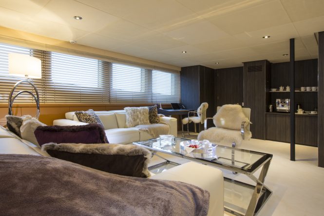 The interior décor is stylish and bespoke. In the generous main salon, opposing sofas and custom tables are centred in the room, with a large TV forward for the ultimate in entertainment. There is a full-service wet bar aft, plus games table, while forward is the formal dining area. Neutral tones set a contemporary inviting ambiance. An additional cosy lounge is situated on the upper deck, aft of the bridge.