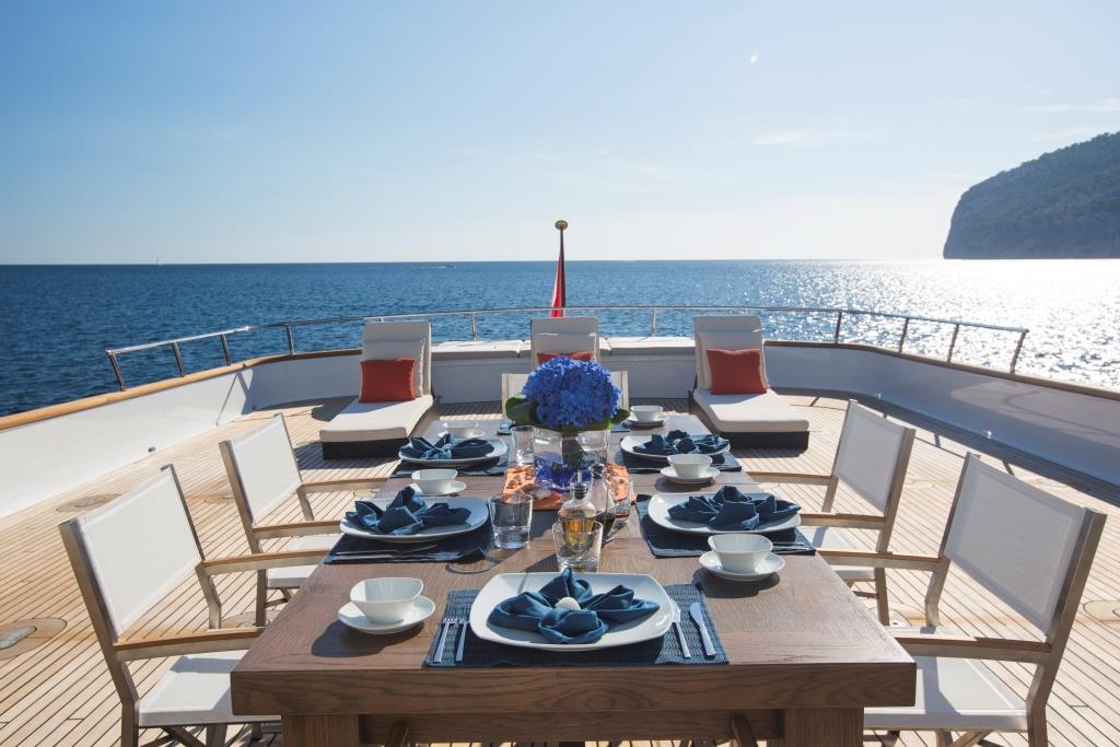 Exterior living is capacious over 3 levels, providing a fabulous outdoor lifestyle. The main deck aft has seating, alfresco dining and is shaded. From here guests can easily enjoy the water toys available on the extended swim platform. An upper deck features alfresco dining, chaise loungers and partial shade. M/Y MQ2 has a lovely sundeck, boasting chaise loungers, seating and a deluxe Jacuzzi.
