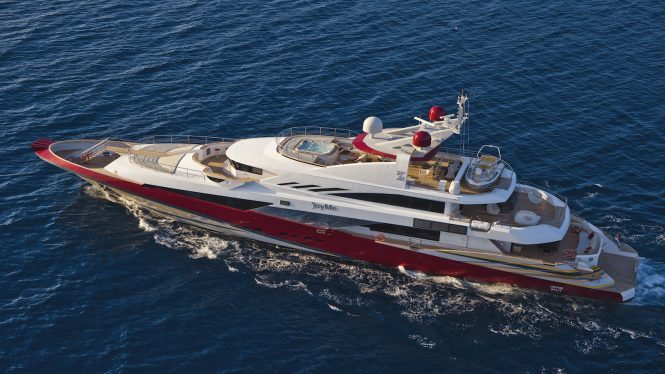 Her fun décor throughout the interior features a different theme in each room, with the main emphasis on tones of red, creating an uplifting ambience. An open-plan salon boasts a cocktail bar upon entering aft, followed by a lounge, and then formal dining area. A standout feature on the main level are 4 guest suites, something not often found aboard luxury yachts. On the upper deck, there is a master stateroom, with a private lounge and a VIP suite. Head down to the beach club and enjoy a workout in the well-equipped fitness gym.