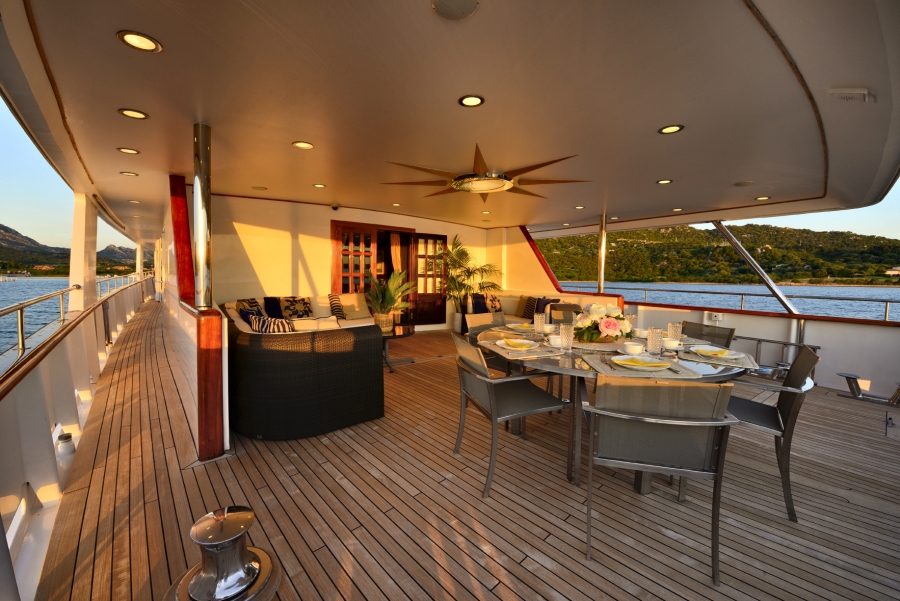 Guests are treated to plenty of alfresco dining opportunities on board, with the main deck aft hosting one dining table and the upper deck aft providing an alternative for any guests using the floor for accommodation.