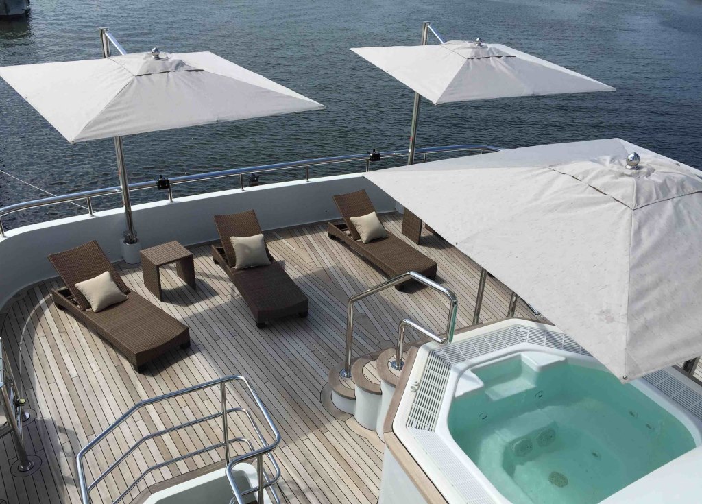 Superyacht JADE 959 is now available in the Mediterranean with an amazing 25% discount on her standard weekly charter rate for event charters to the Cannes Film Festival and the Monaco Grand Prix. M/Y JADE 959 is packed with amenities, and well as an on board massage therapist, her sundeck features an outdoor cinema, karaoke, a Jacuzzi and wet bar.