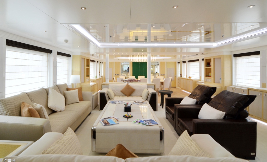The large main salon uses pastel shades of blue and yellow for a calm and refreshing space in which to gather and socialise. Plush sofas and armchairs surround a long coffee table ideal for relaxing with reading material or board games while the aft wet bar can serve apéritifs before dinner.