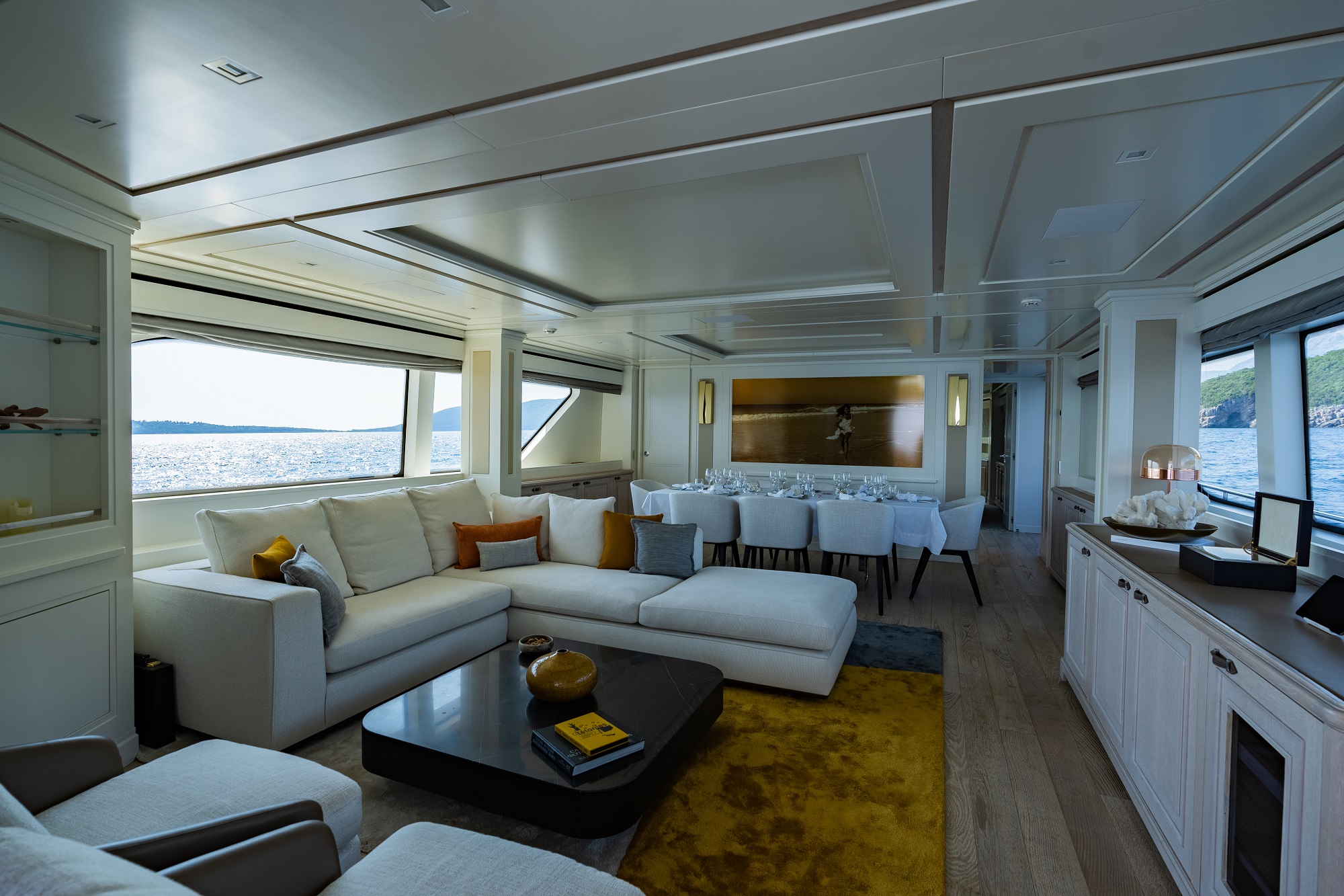 Her main salon is elegantly finished with classic panelling in a soft neutral tone, plush sofas and formal dining. A raised pilot house allows a master suite to be placed forward on the main deck, which is ideal for grandparents, while the lower deck suites – a full beam master and two twins – would suit a large family.