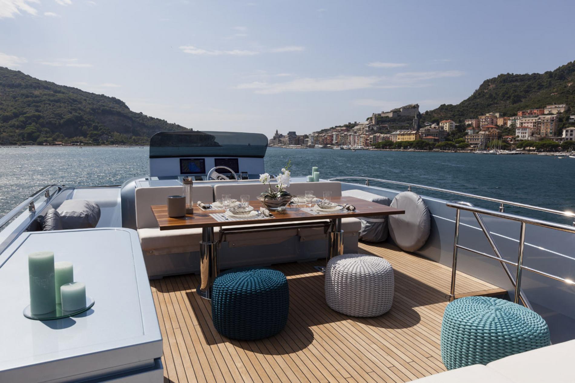 The exterior social areas include several spots for casual dining, sunbathing and lounging in the sunshine or shade. Both the main deck aft and flybridge have an abundance of sunbeds to rest after a delectable multi-course meal, while the foredeck is a cosy spot for drinks and conversation as a seascape panorama stretches out in front of you.