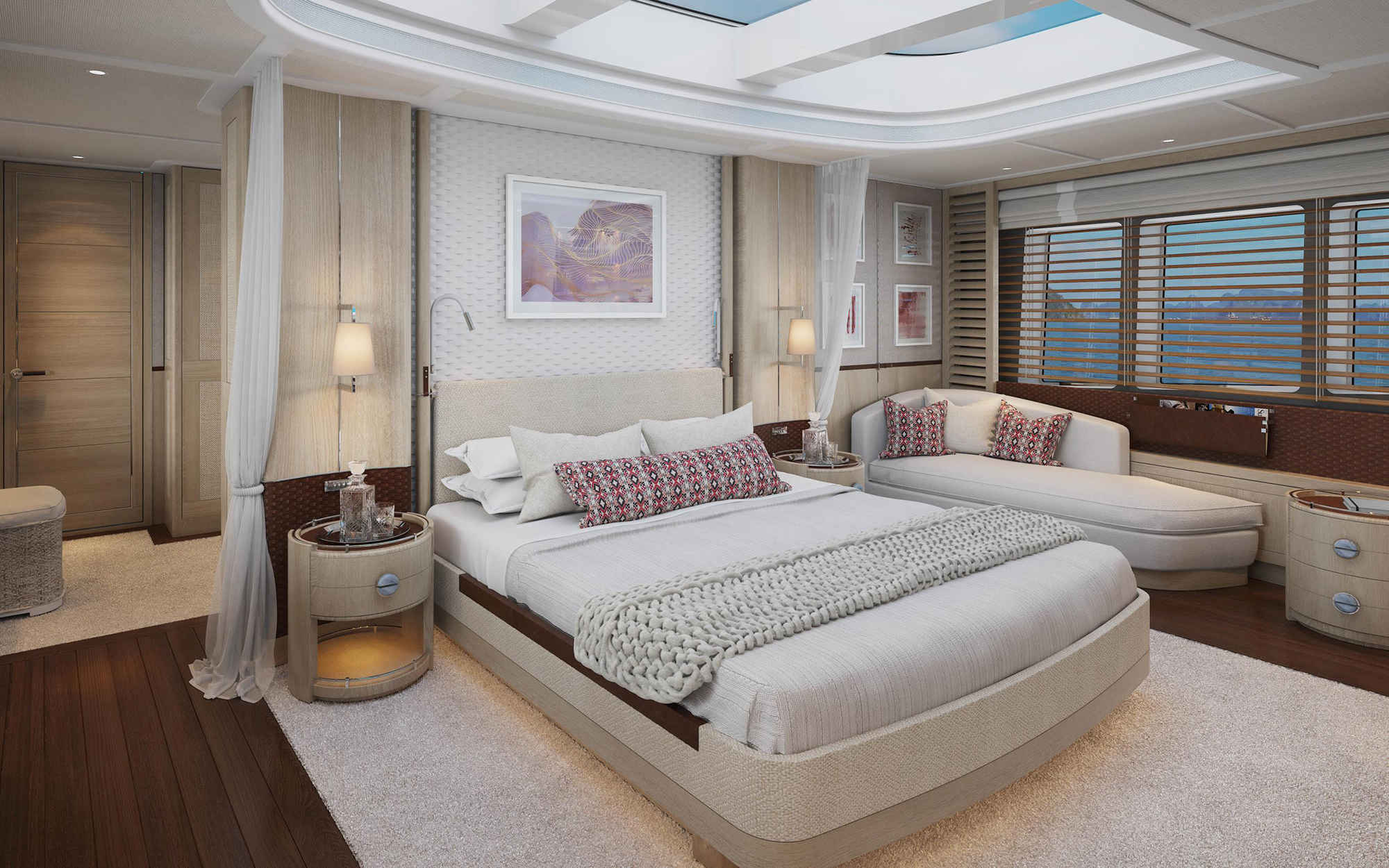 The beach house-style interior is beautifully finished with light tones and bespoke touches. Her main salon offers a unique layout, where the lounge is aft, a full-service cocktail bar centred, followed by a formal dining area. With floor-to-ceiling windows, the space receives excellent natural light and boasts spectacular views.