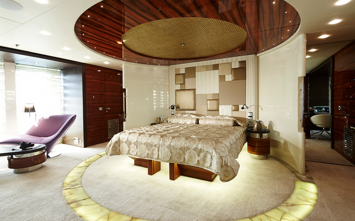 The interior design by Art-Line uses creamy white furnishings and metallic gold accents against carefully applied dark wooden panelling, creating bright and interesting interiors rest, relaxation and socialisation at any time of the day. A circular formal dining table is located forward of the main salon and shares the same open plan area for a comfortable dining experience between 10 guests.