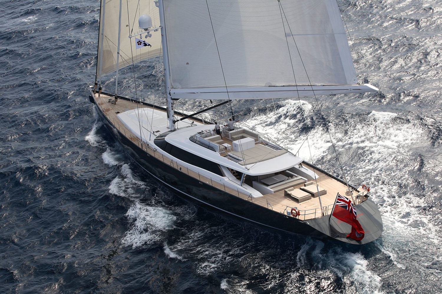 On deck, S/Y RED DRAGON has two levels with plenty of space to relax and entertain, both at anchor and under sail, while cruising the Amalfi Coast, Aeolians, Corsica and Sardinia. The main deck aft boasts shade, alfresco dining and sun pads further aft. On the stern, a generous fold out transom creates a fabulous swim platform. An additional deck above has optional sunning, seating and another outdoor dining arrangement.