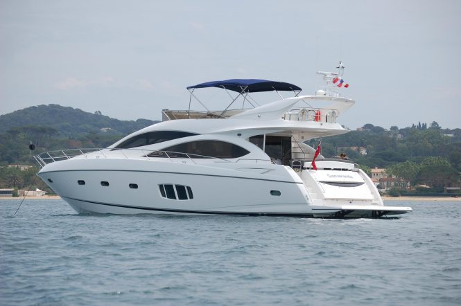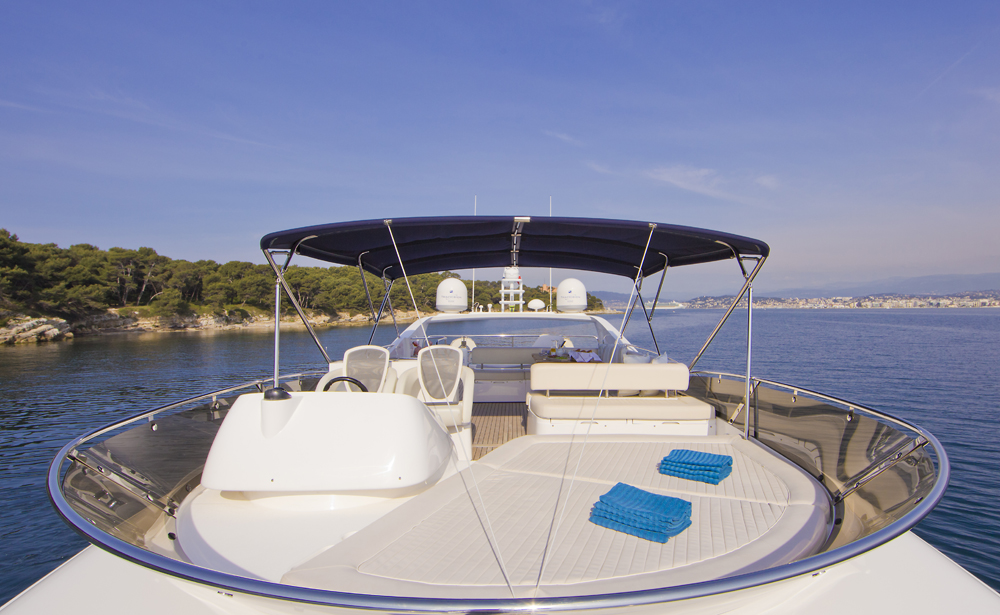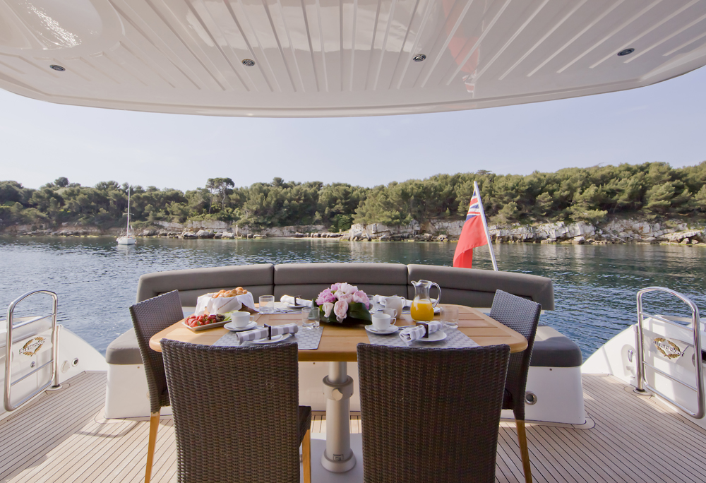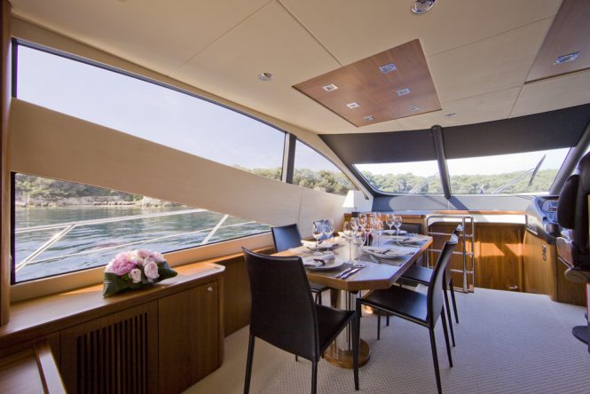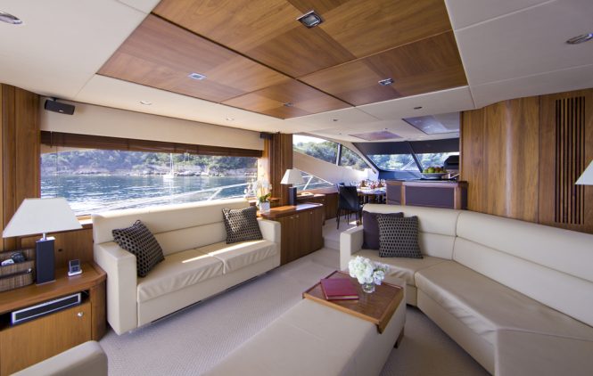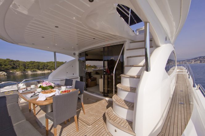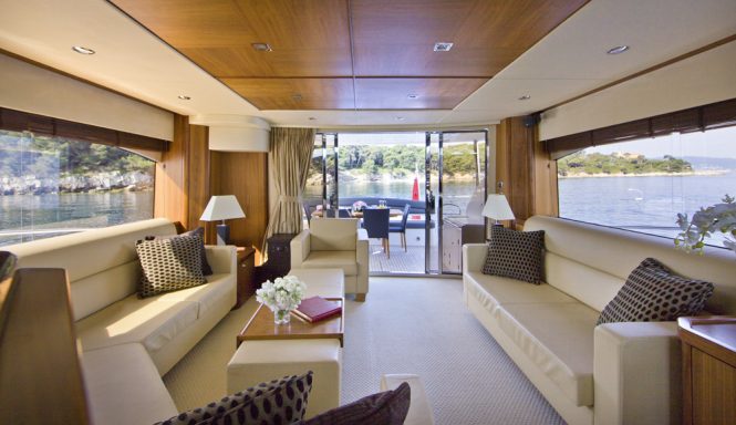Built by Princess Yachts in 2014, she has a lightweight GRP hull for a draft of under 2 metres that allows her to access shallower anchorages and get closer to the best beaches.