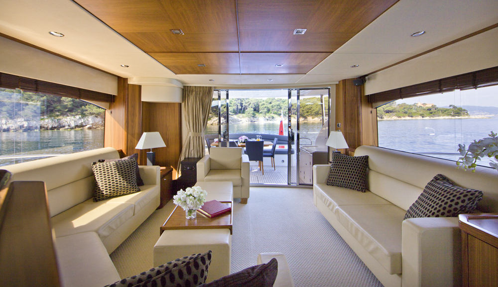 The beautiful main salon uses warm shades of walnut and apricot to create a warm and joyful social area where guests can dine in style, watch TV or simply relax on the L-shaped sofa and watch the world go by.