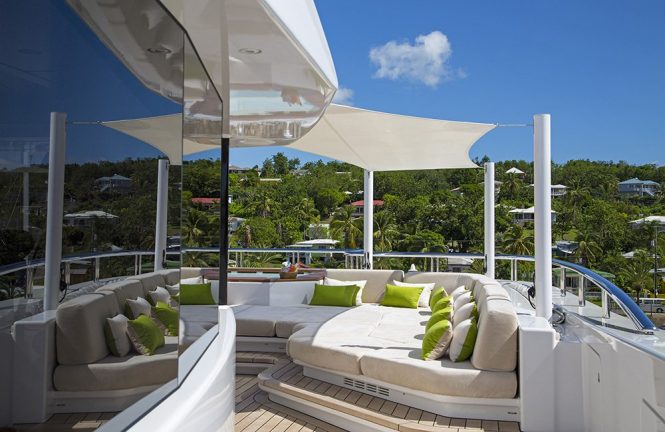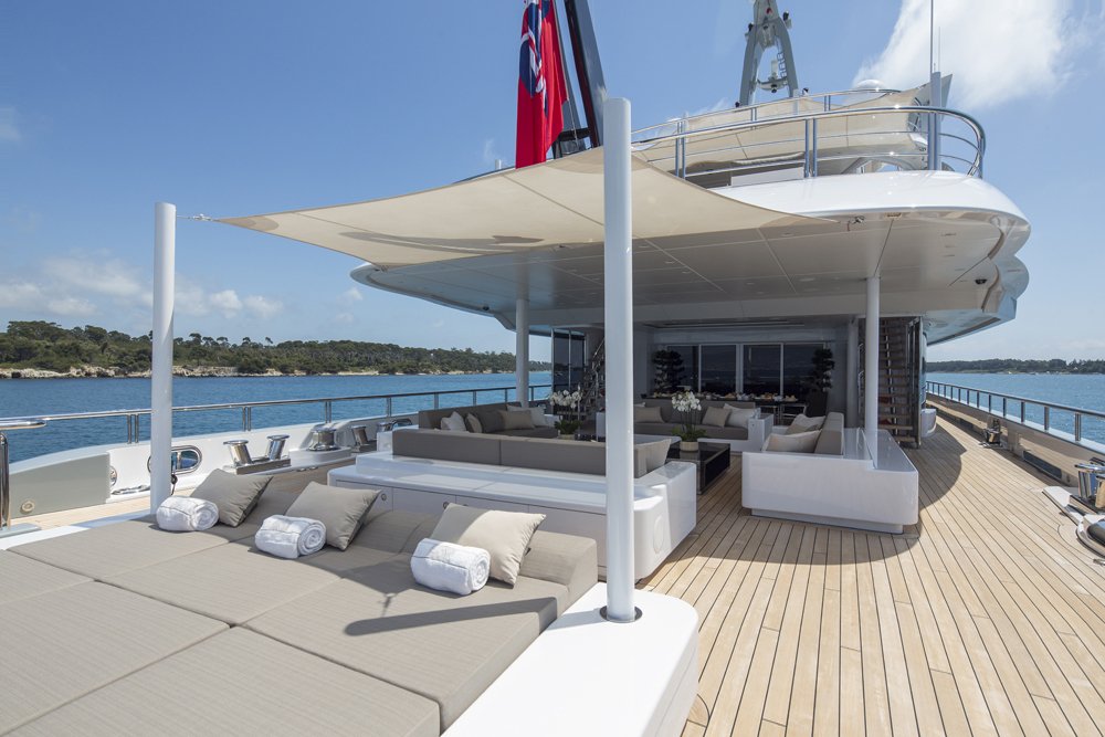 Watch all the action of the Grand Prix from the sundeck as you soak in the forward sunken Jacuzzi or while lying out on the surrounding sun pads. To the aft, the large outdoor lounge is an excellent setting for alfresco dining or an evening of entertaining, while the aft sun pads take in the sunshine of the Arabian Gulf.