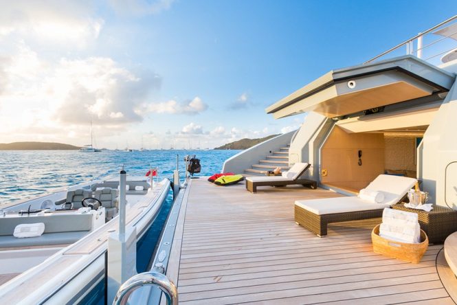 Greet your guests in style from the aft swim platform, where the transom opens up to expose the beach club within. Steps lead up to the sheltered outdoor lounge perfect for morning coffee or living outdoors throughout the day. Further forward, the alfresco dining table seats up to 12 guests for an incredible meal among guests with views out onto your surroundings.