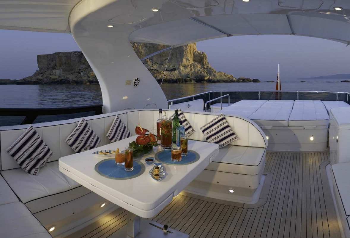 The main deck aft offers an alternative dining spot out in the open fresh air, or guests can head up the steps to reach the flybridge for even more options.