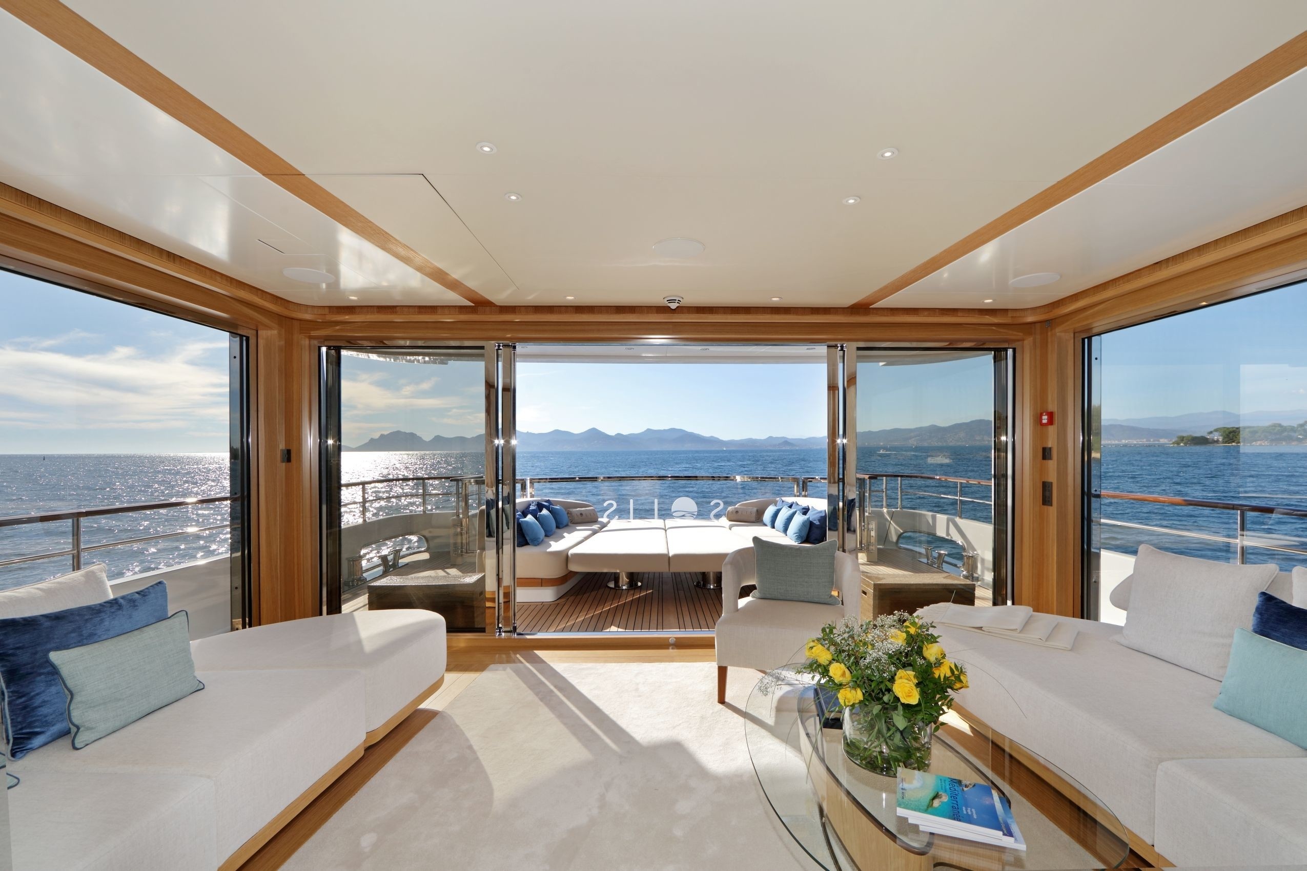 Huge windows and great indoor-outdoor flow between main saloon area and aft exterior relaxation area on the main deck
