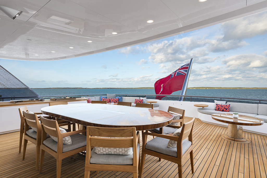 Exterior living spaces are spanned over three decks. The main deck aft hosts a cosy seating, AV entertainment system and a full bar.