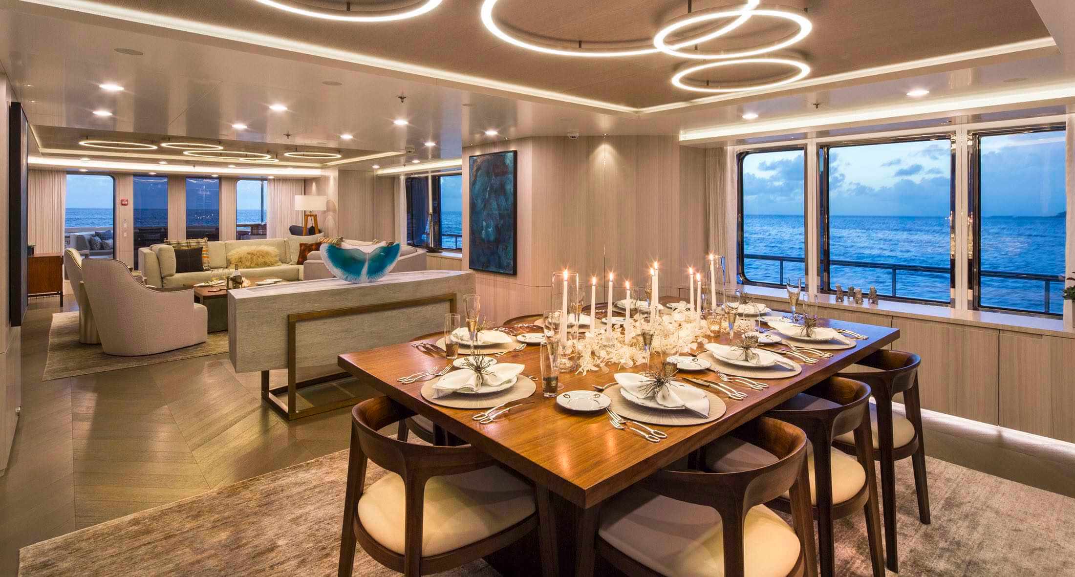Built in 2000 ad refitted in 2017, PICNIC features the light touch of Adam Voorhees, who chose understated modern elegance with a pop of colour to enhance each room. In the main salon, circular ceiling lights draw in the eye to the inviting seating area. The formal dining area has a large selection of wine in the chilled cabinets right beside the grand table, and the sky lounge has more seating, a bar and card table to entertain after sundown.
