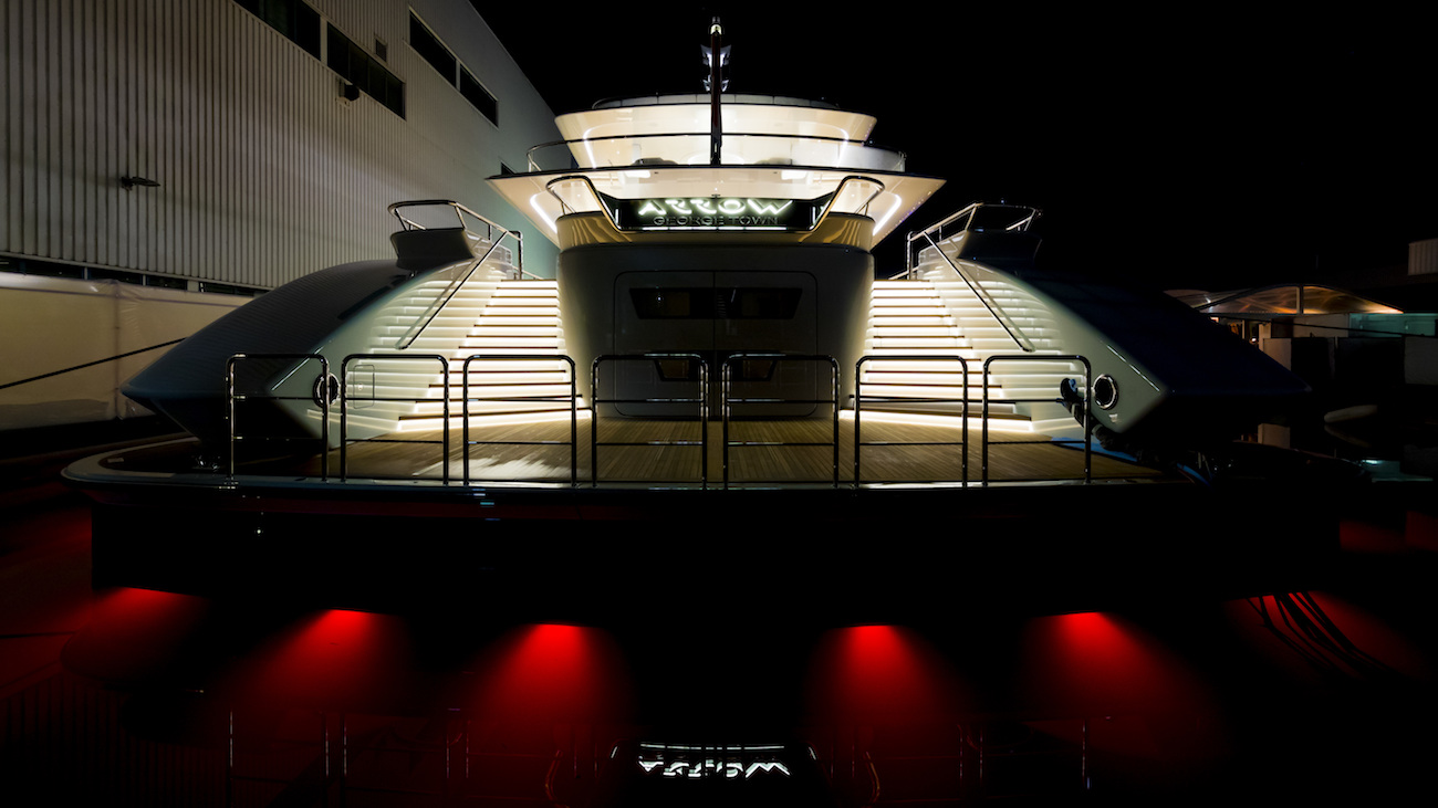 The spectacular 75m superyacht ARROW was christened ahead of her sea trials and delivery for 2020 summer charter season. With cutting edge design and head-turning sharp profile designed by H2 Yacht Design, the brand-new Feadship presented herself in the very best light, illuminated by dramatical lighting in various colours.