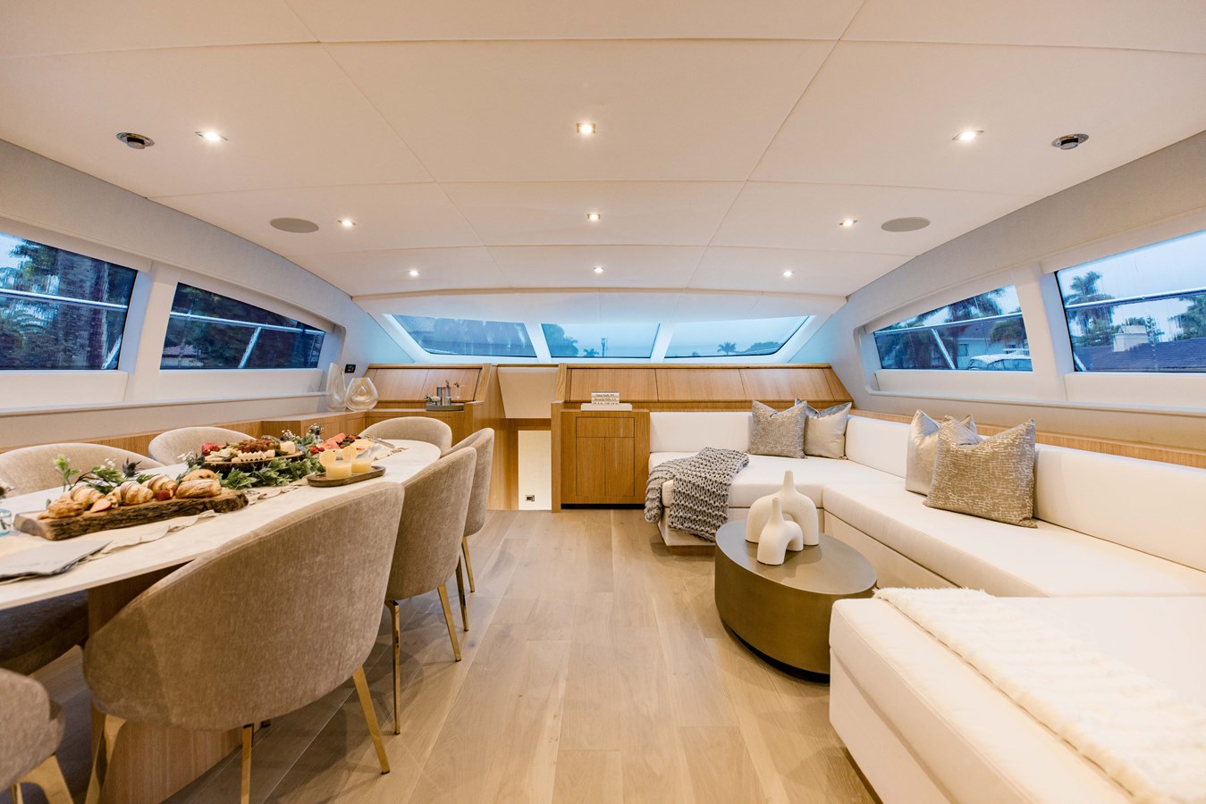 Elongated elliptical windows emphasise the sweeping profile from the bow down to the aft cockpit which hosts the primary al fresco entertainment space. Elegantly furnished in teak and neutral soft furnishings, there is a dining table, bar and sofa area. The space can be covered by a soft binimi making it flexible for all weathers.