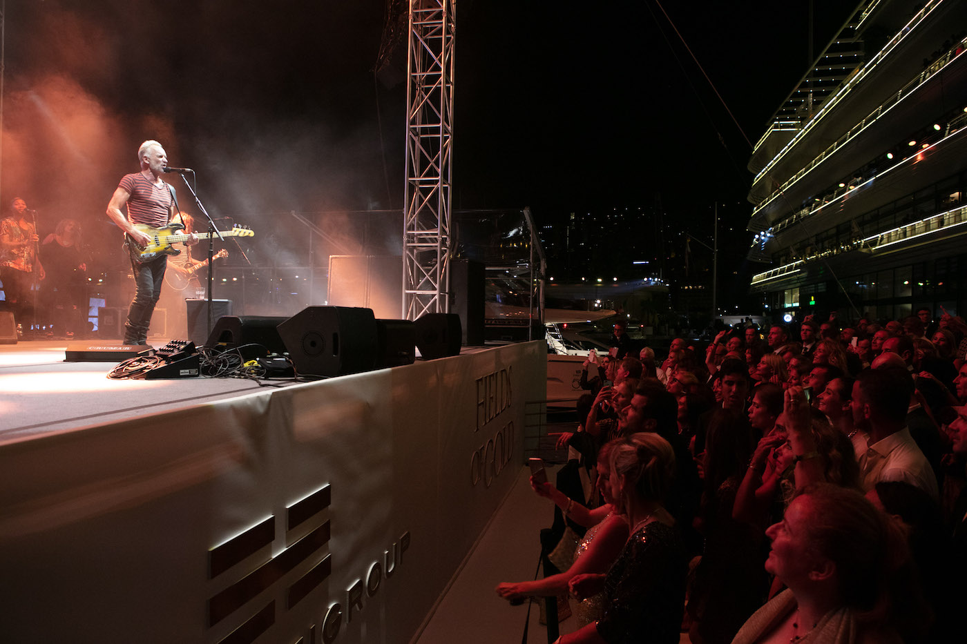 A fleet of more than 30 luxury yachts from shipbuilders Ferretti Yachts, Pershing, Riva, Itama, CRN and Custom Line were on show in front of the Monte-Carlo yacht club as Sting played hits from his solo career and from his band The Police, including ‘Roxanne’, ‘Message in a Bottle’ and ‘Fields of Gold’, for which the concert is named.