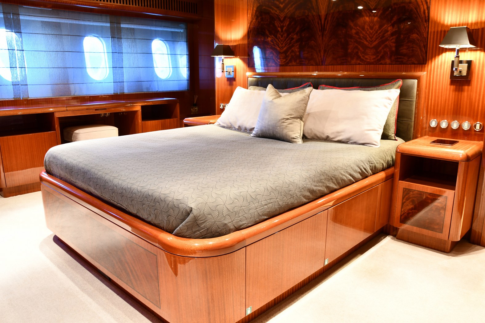 A modular main deck aft allows your crew to rearrange the furniture to suit your needs – from sunbathing and lounging to alfresco dining and dancing under the stars. Even more sunbathing space can be found on the bow, and the lower deck swim platform is deep enough for lounging beside the sea.