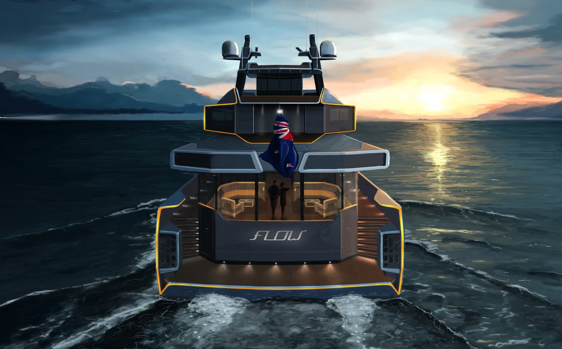 Luxury yacht FLOW concept is a muscular yet highly styled family vessel, boasting numerous new innovations, comprising enclosed “beach house” on the aft deck, as well as family treasure cabinet, hosting the collection of shells, stones and artifacts, collected during the voyages. Moreover, the vessel features “gull wing lookouts” from the skylounge, providing a unique perspective on the changing landscape outside and amazing perforated window graphics personalised by the owner.
