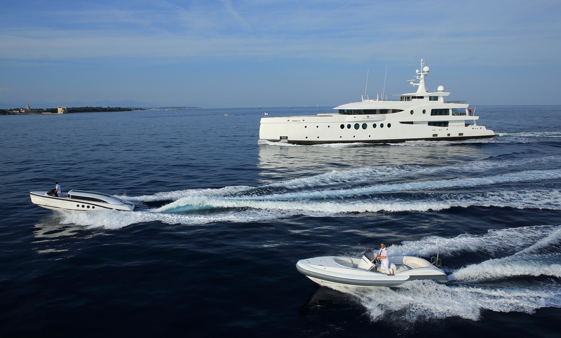 The forward tender garage is very large for a 60-metre yacht, holding an 8m limo tender and a 6m MOB tender, as well as water toys, including Waverunners. The tenders can be easily deployed in under 5 minutes thanks to overhead cranes in enormous gullwing doors. Above the tender garage, the Owners opted for a touch-and-go helipad.