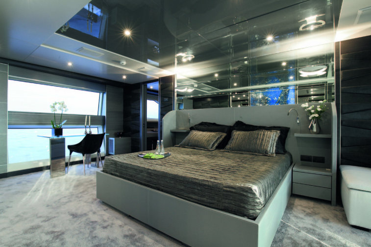 Featuring a very modern style, the furnishings of luxury yacht IRON MAN were developed by the interior designer Alfred Karram Jr, and boast a predominant use of grey wood next to the ceiling’s black and white. The crystal dining room table and steel detailing provide a clear sensation of technology.
