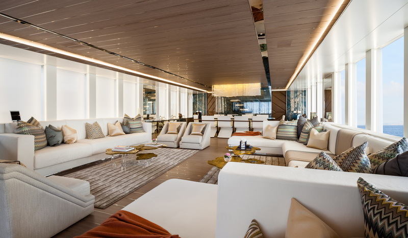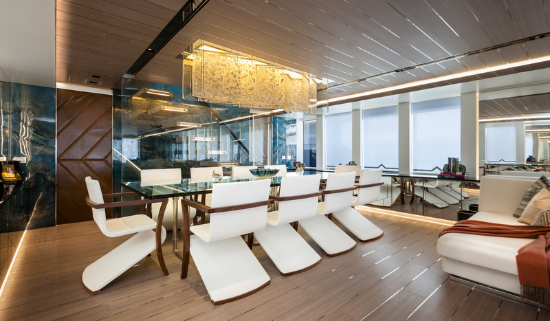 Accommodation is offered to 12 guests across six luxuriously appointed staterooms configured as a master suite, three VIP staterooms and two twin guest cabins. The interiors are huge and very bright, and are fitted with exquisite pieces of furniture, panels, lighting, sculptures and eye-catching details. The foredeck represents the most extensive owner’s private deck in its category enriched by an amazingly large swimming pool that can be covered making of the forward deck a big party area.