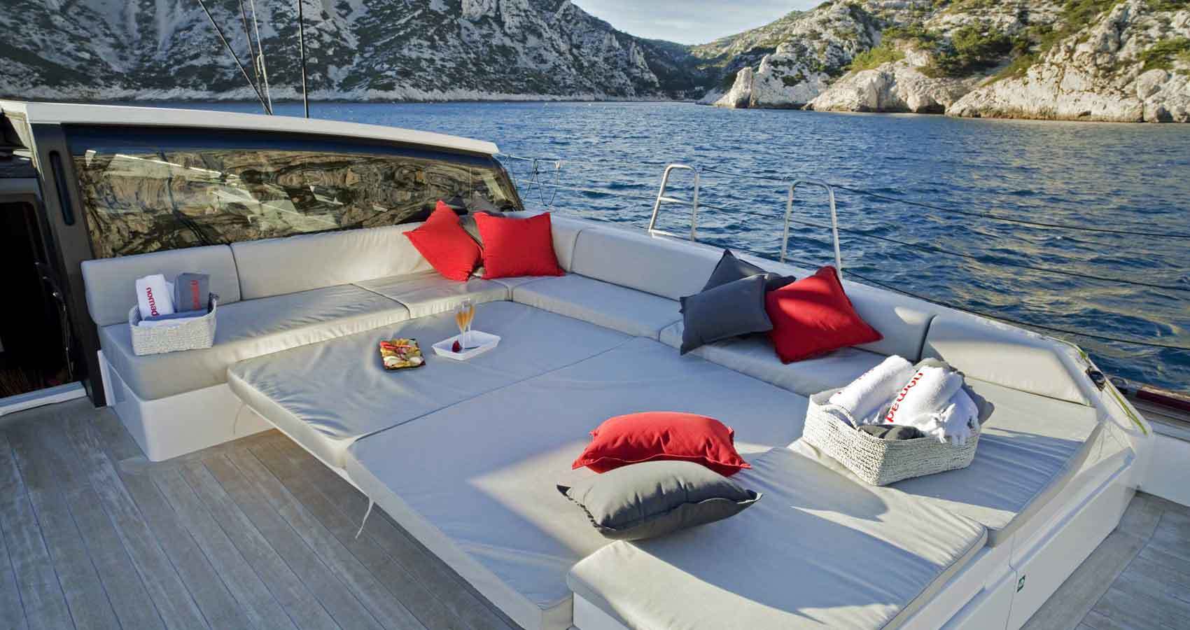 Above deck, the cockpit contains two seating areas designed for alfresco dining and outdoor lounging out in the sunshine and fresh air. There is plenty of space on the foredeck for sunbathing or exercise such as Tai Chi or Pilates.