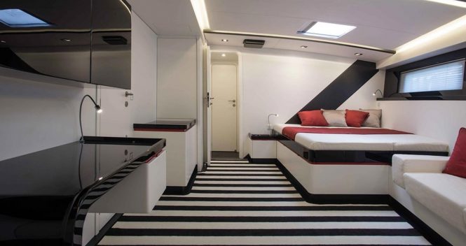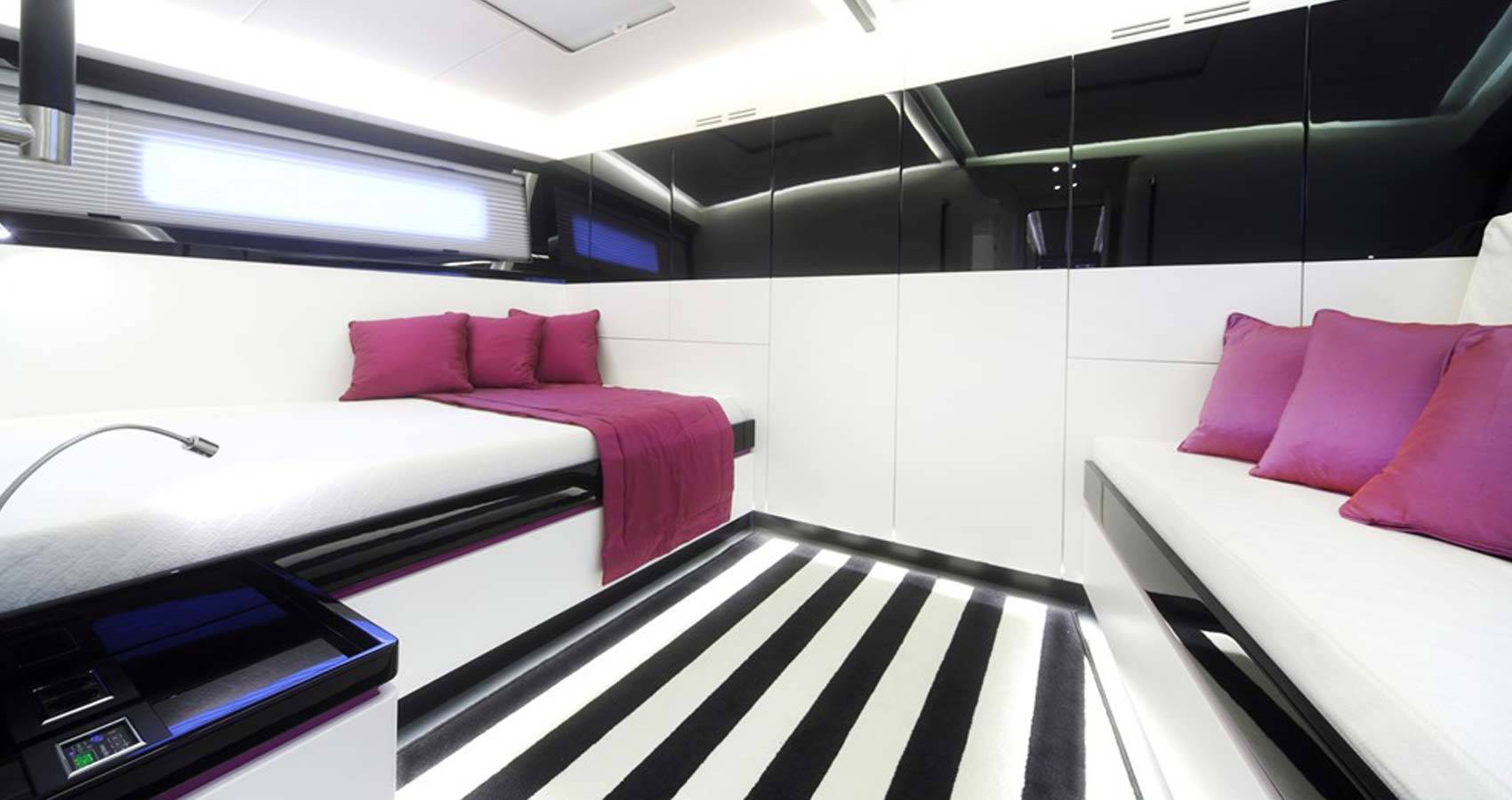 The interior is bright and invigorating, using black beams and accents against white furnishings and walls while the fuchsia colour of the hull is used as an accent. Gloss textures on the formal dining table play with the light in the matte environment, which is surrounded by windows for natural lighting throughout the day and views of the stars at night. The salon also contains an L-shaped lounge with coffee table for rest and recuperation after a busy day exploring such destinations as St. Lucia and St. Kitts & Nevis. The spacious cabins are just as well considered and skylights enhance these sleeping quarters.